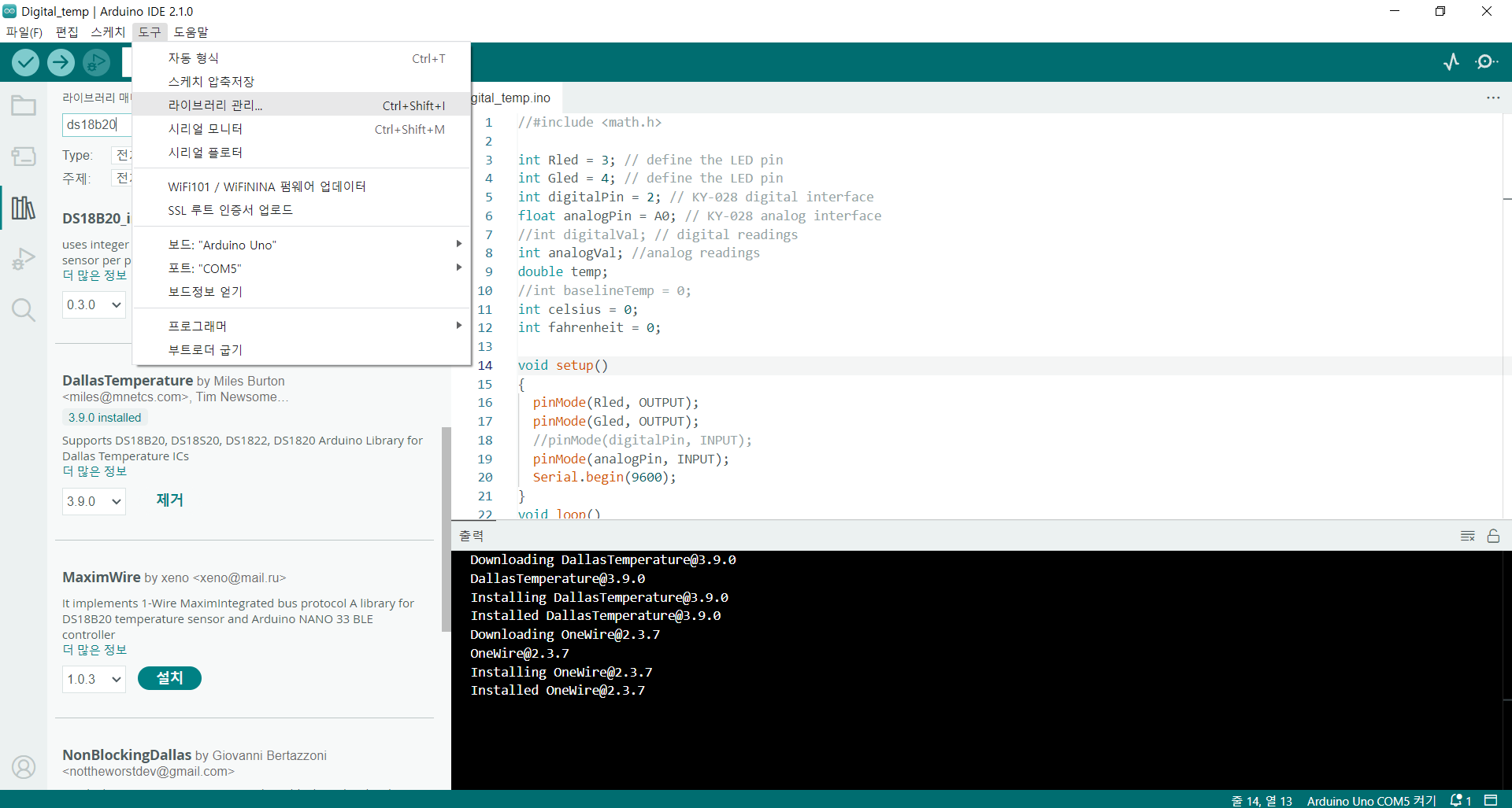 코드를 보시면 OneWire.h와 DallasTemperature.h 헤더파일이 있습니다. 컴파일을 하기 위해서는 아두이도 프로그램에서 라이브러리를 설치해야 하는데 아래에서 찾으실 수 있습니다. 라이브러리 매니저에서 ds18b20과 onewire로 검색 후 설치하시면 됩니다.