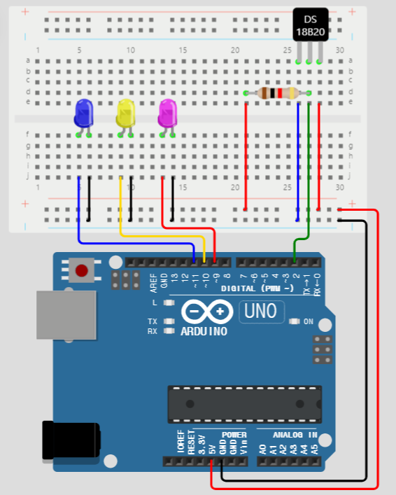 이번 프로젝트에는 온도를 측정하는 센서가 추가되는데 DS18B20이라는 부품입니다. 기존의 온도센서 출력은 아날로그로 되어있기 때문에 아두이노에서 입력을 디지털로 받기 위해서는 analog를 digital로 변경해 주는 부품을 추가로 추가해야 합니다. 그래서 DS18B20안에 A/D변환 칩을 넣어 한번에 해결하였습니다. 가격도 기존 구성회로보다 낮출 수 있어 경제적이고 신호를 출력하는 Onewire 통신이 있어 아두이노 플랫폼과 완벽하게 호환됩니다. 소스코드 부분에서 설명드리겠지만 이 부품을 사용하기 위해서는 특정한 라이브러리를 사용해야 합니다. 우선 회로 구성은 아래와 같습니다.