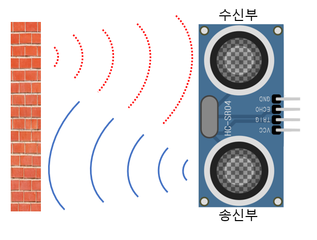 송신부에서 초음파를 발생하여 물체에 닿은 후 수신부로 들어오게 되는데 전파가 이동한 시간을 측정하여 거리로 계산하는 방식으로 동작합니다.