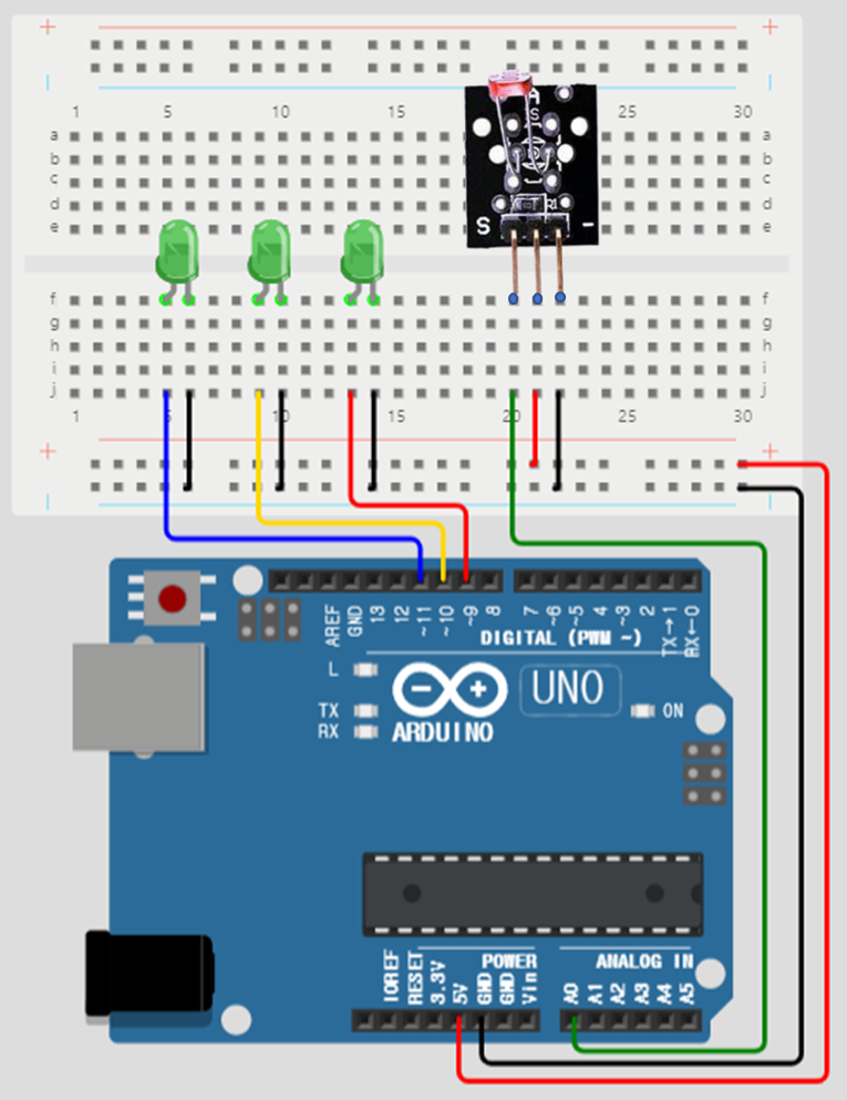 회로 구성은 아래 그림과 같습니다. 밝기에 따라 LED 수를 변경하여 구분하도록 구성하였습니다. 밝기 값이 제일 높을 때는 LED를 켜지 않고 가장 어두운 값을 가질 때는 3개의 LED를 모두 켜도록 하였습니다. 센서의 출력은 A0 아날로그 입력핀에 연력하여 밝기 값을 읽을수 있도록 연결하였습니다.